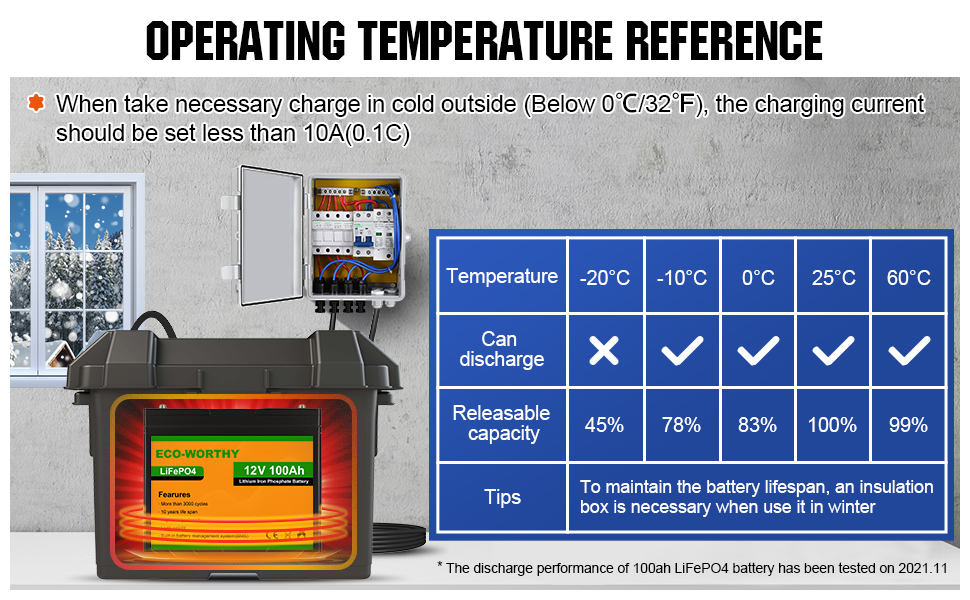 Die Batteriekapazität bestimmt, wie lange die Lasten nach dem Anschluss an den Wechselrichter laufen können. Daher ist es unbedingt erforderlich, die Batterie an einem warmen Ort aufzubewahren. Oder wenn Sie sie tatsächlich an einem kalten Ort verwenden möchten, bereiten Sie eine Heizbox oder Batteriebox vor, um sie vor der eisigen Luft zu isolieren.